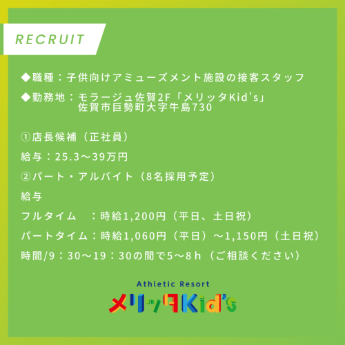 🔸勤務地:モラージュ佐賀北館2F「メリッタKid’s モラージュ佐賀」 佐賀市巨勢町大字牛島730