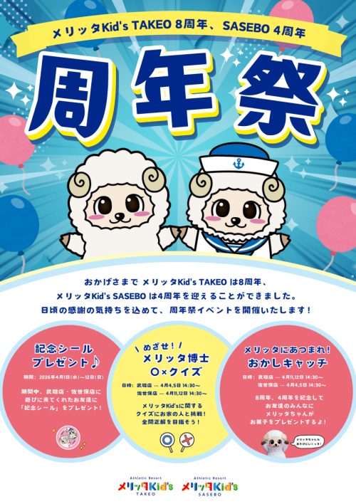 皆さまのおかげでメリッタKid’s TAKEOは8周年、メリッタKid’s SASEBOは4周年を迎えました。