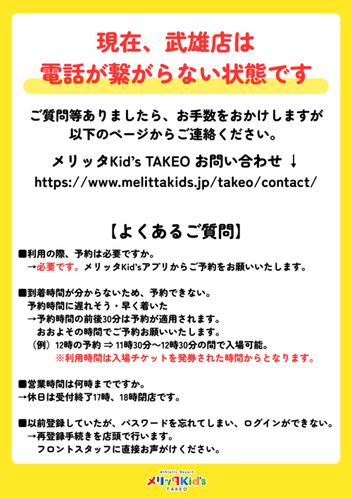 2026年2月8日現在、メリッタKid’s TAKEOは不具合により電話が繋がらない状態です。