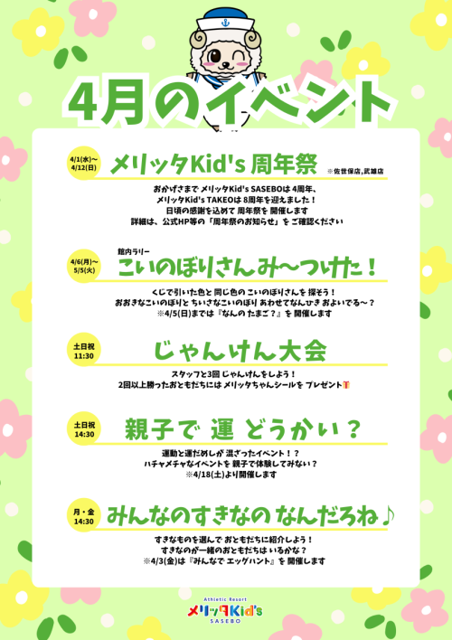 4/1(水)~4/12(日) メリッタKid's 周年祭 ※佐世保店、武雄店